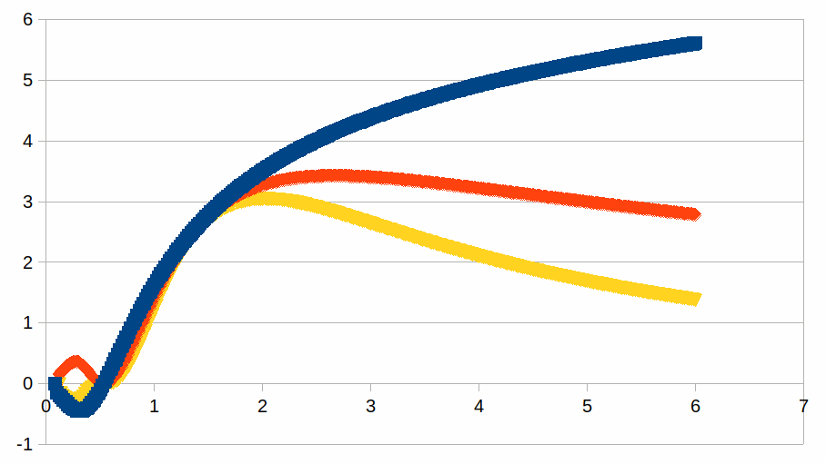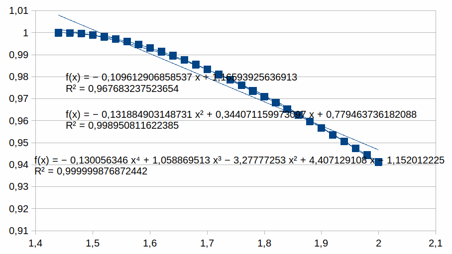 Zoals we aantoonden modelleert een k=0 stabiliteit. De vorm van de afname na de piek is een polynoom, hoe hoger de graad, hoe beter de curve benaderd wordt. We tonen daar een paar voorbeelden van, vanaf het maximum van k (dat bereikt wordt op stap 1,44).