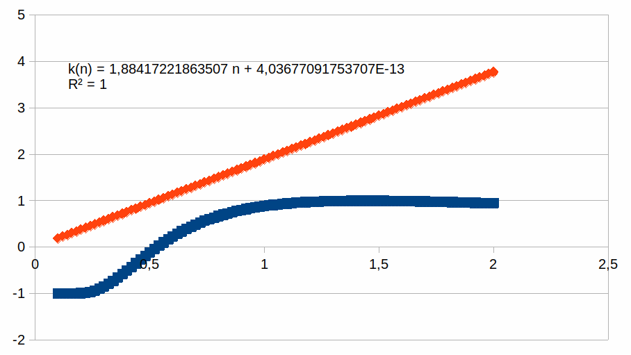 Hieronder geven we een voorbeeld voor een k(n)=((an)1/n-1) die positief is en juist kleiner blijft dan 1. Dit voor een versnelling a=1,88417221863507 (gegeven resolutie van hardware en software). Er zijn honderd processtappen geplot vanaf 0,1 in stappen van 0,02. De variatie van k, die kleiner blijft dan 1, is gegeven met een vierkant datapunt (de onderste curve). De resulterende lineaire toename van de snelheid (namelijk de cumulatie (1+k)n is gegeven met een ruit datapunt. De vergelijking van de rechte en zijn determinatiecoëfficiënt (R2=1) zijn ook aangegeven. De versnelling zien we in de coëfficiënt van n.