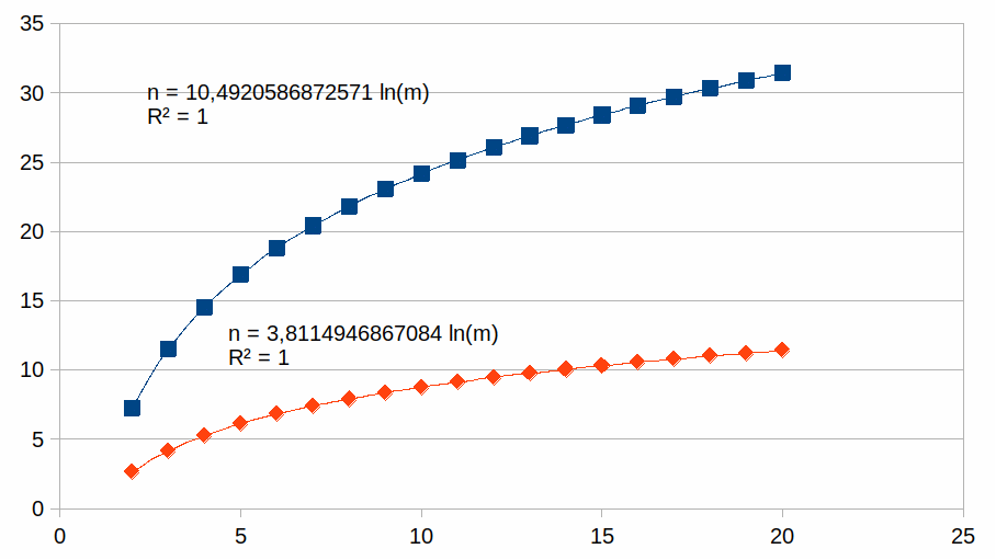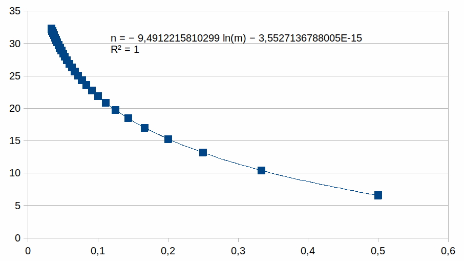 We geven nu een aantal voorbeelden. De variabele m wordt gegeven op de abscis en zoals elke logaritmische curve kunnen we n uitdrukken als een gewogen natuurlijke logaritme en de vergelijking is opgenomen als n in de grafiek.