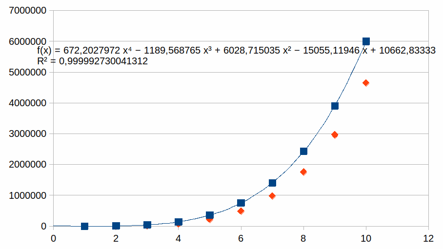 (Het kwadraat) van de tijdrek meten we als γ12γ21. Hieronder geven we de evolutie van γ12γ21 van de ontoegankelijke klok voor “output” ervan (vierkant datapunt) en “input” (ruit datapunt) in functie van de stappen in het proces en de polynoom van de vierde graad voor het vierkant datapunt.